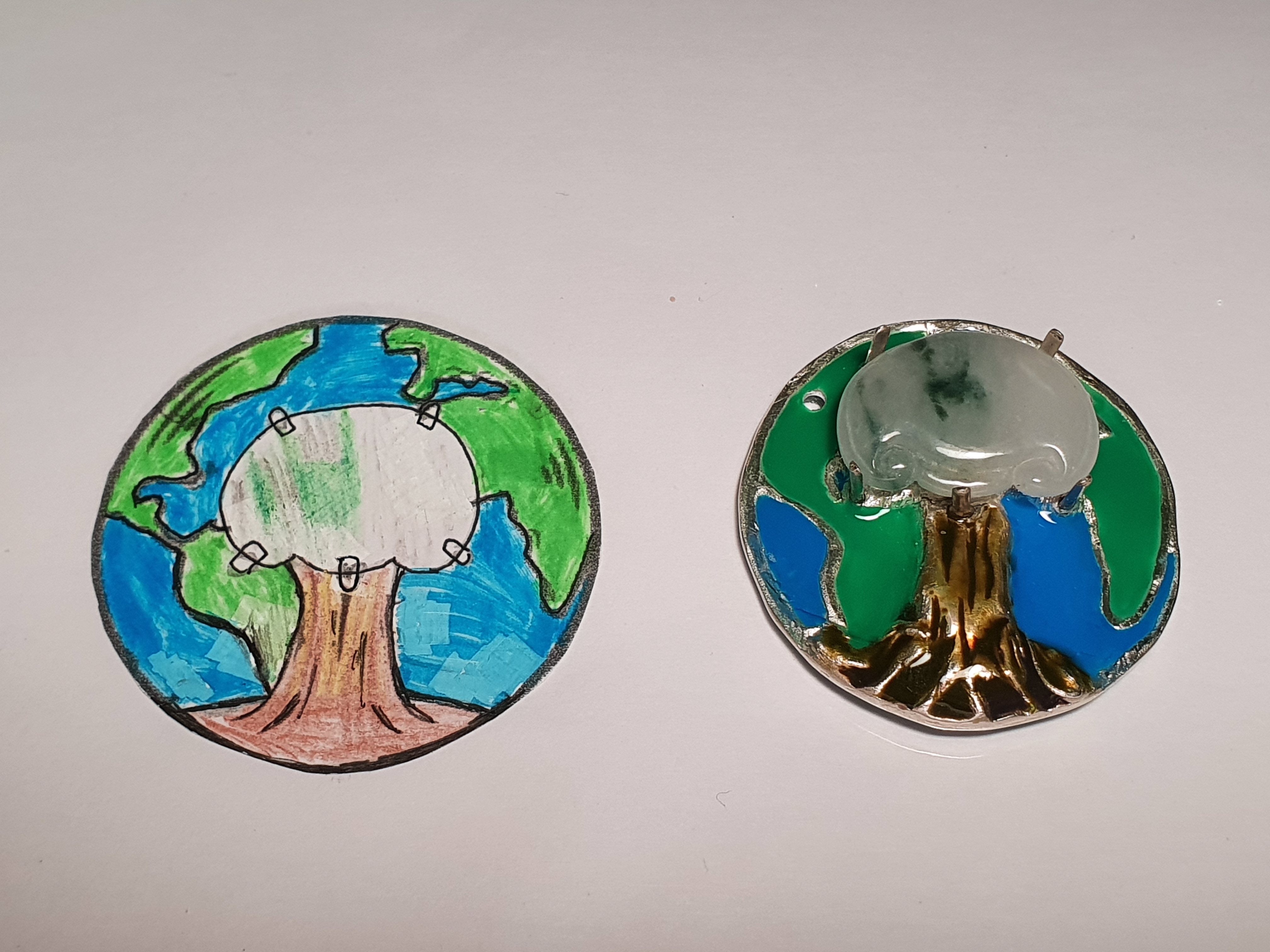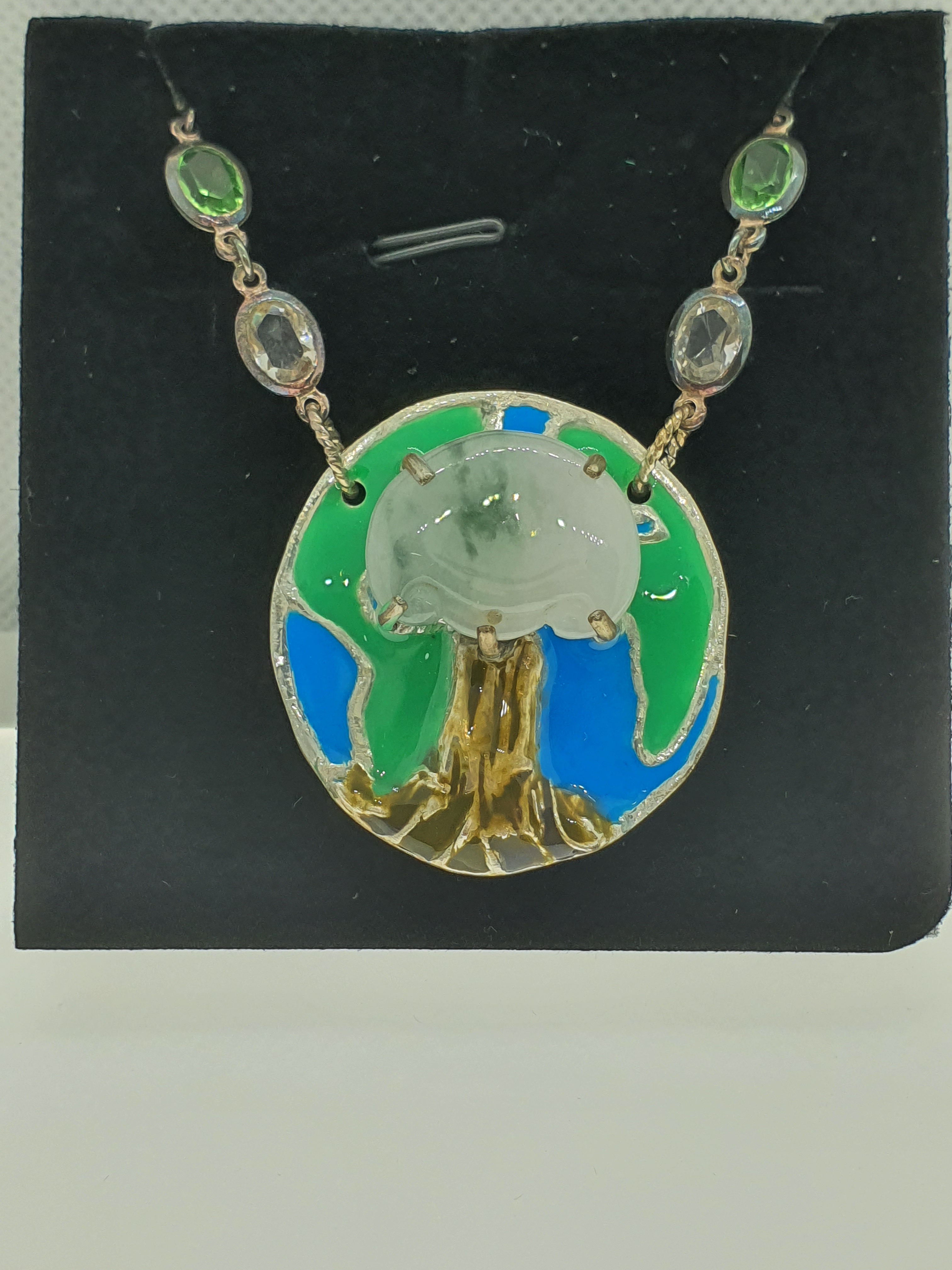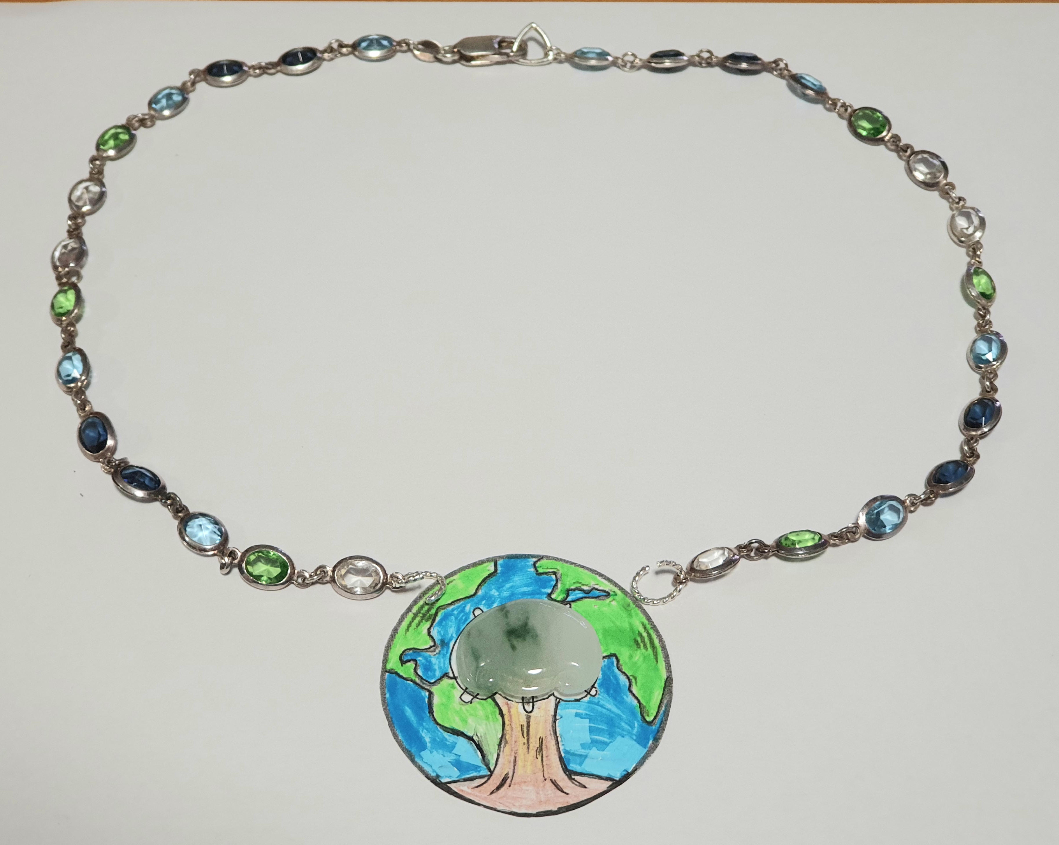 | Story of the piece | Most parts of two old necklaces and an old bracelet were upcycled and transformed into a necklace. The jade pendant from the old necklace is whitish with some shades of green. When the pendant is inverted, it can be viewed as the crown of a tree. As trees are considered the lungs of the Earth, this is related to the theme: Mother Earth. This becomes the centerpiece in the new necklace. This centerpiece (a.k.a. Lungs of the Earth) is fashioned as a tree with planet Earth in the background. The planet Earth in the background is self-explanatory as it represents itself. The clear, green and blue stones taken from both the old necklace and bracelet, now forms the chain for the new necklace. The colours of the stones represent the land and sea on Mother Earth. The upcycled parts are made of 925 silver, 999 silver and jade. |