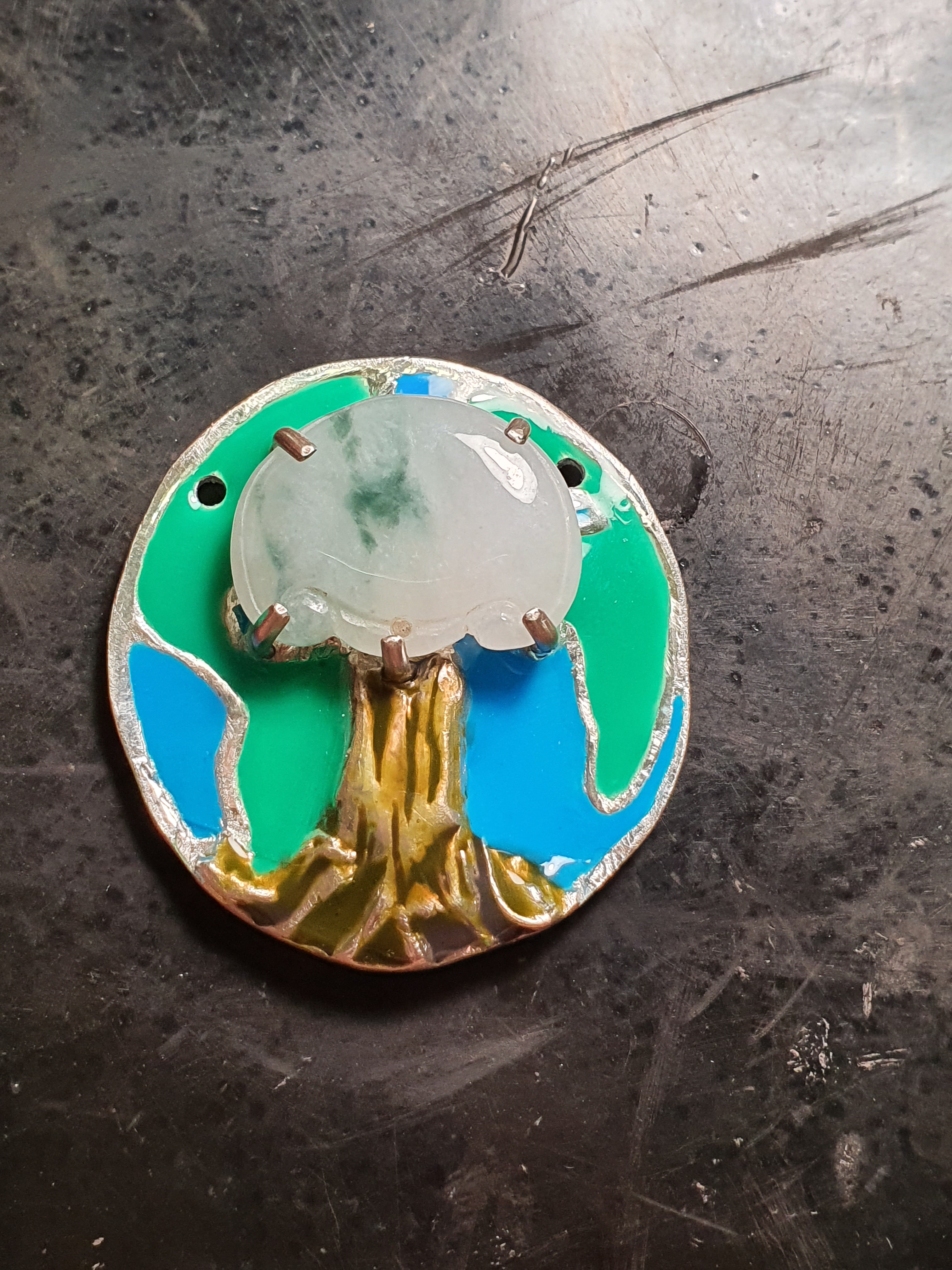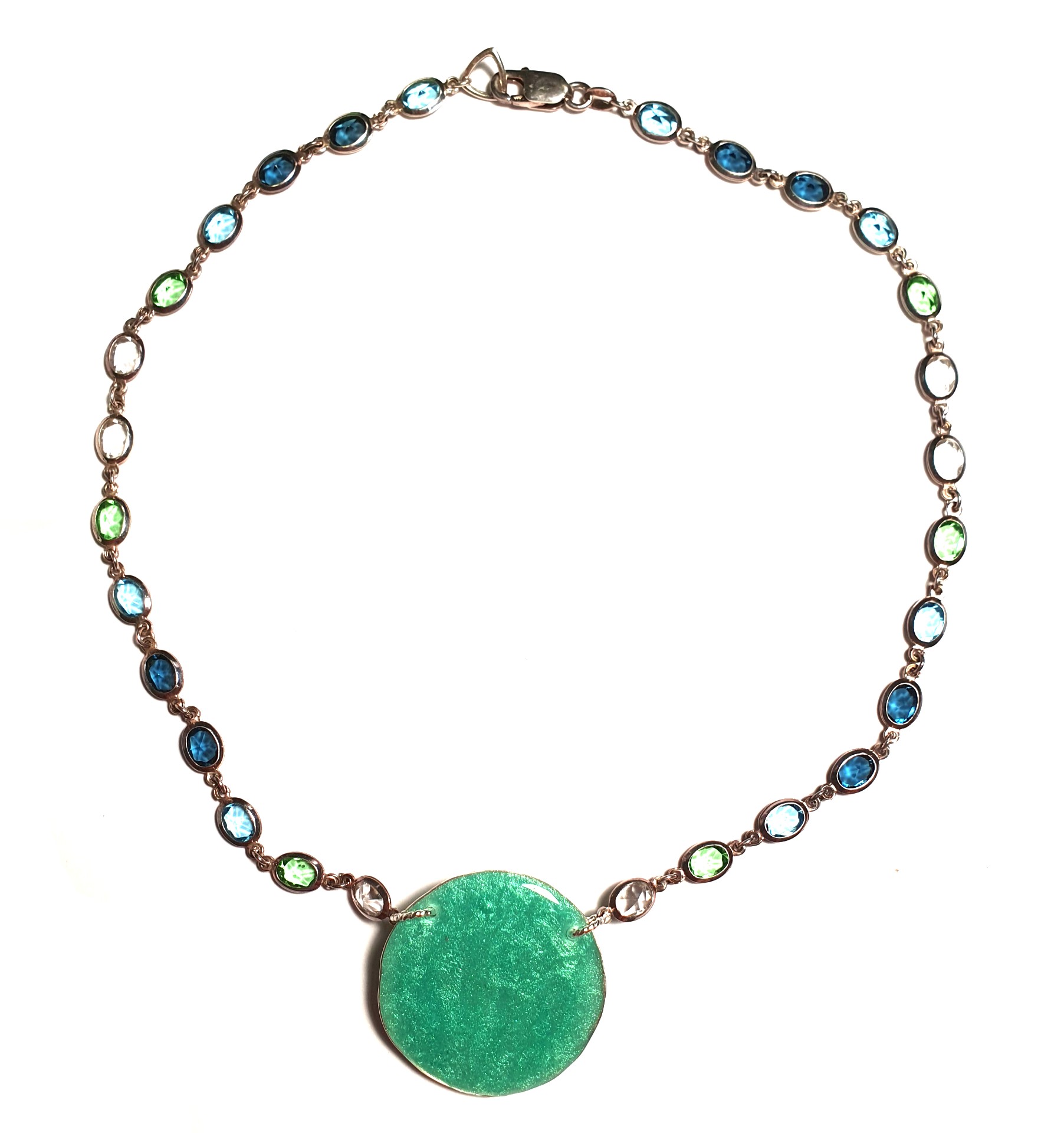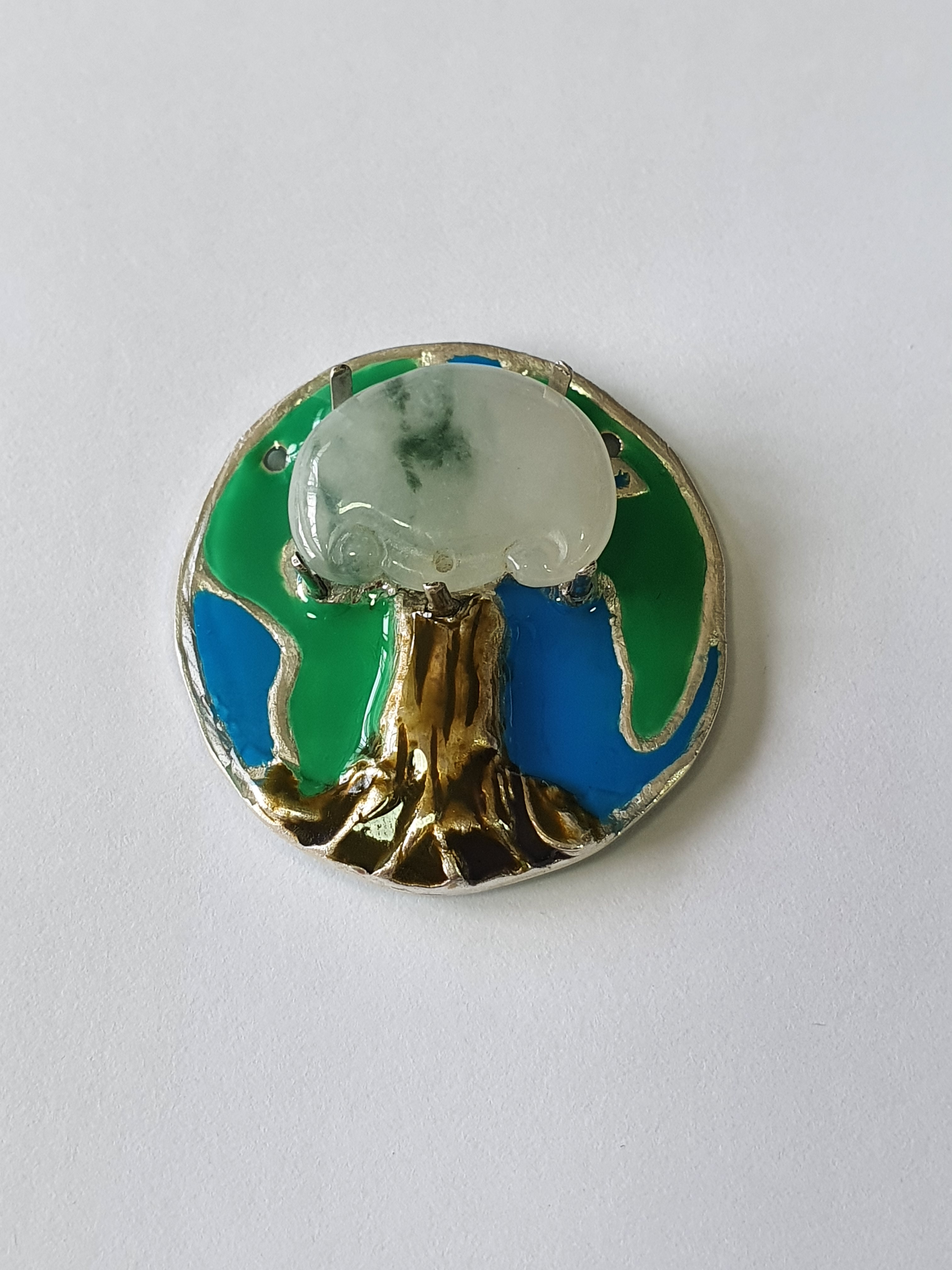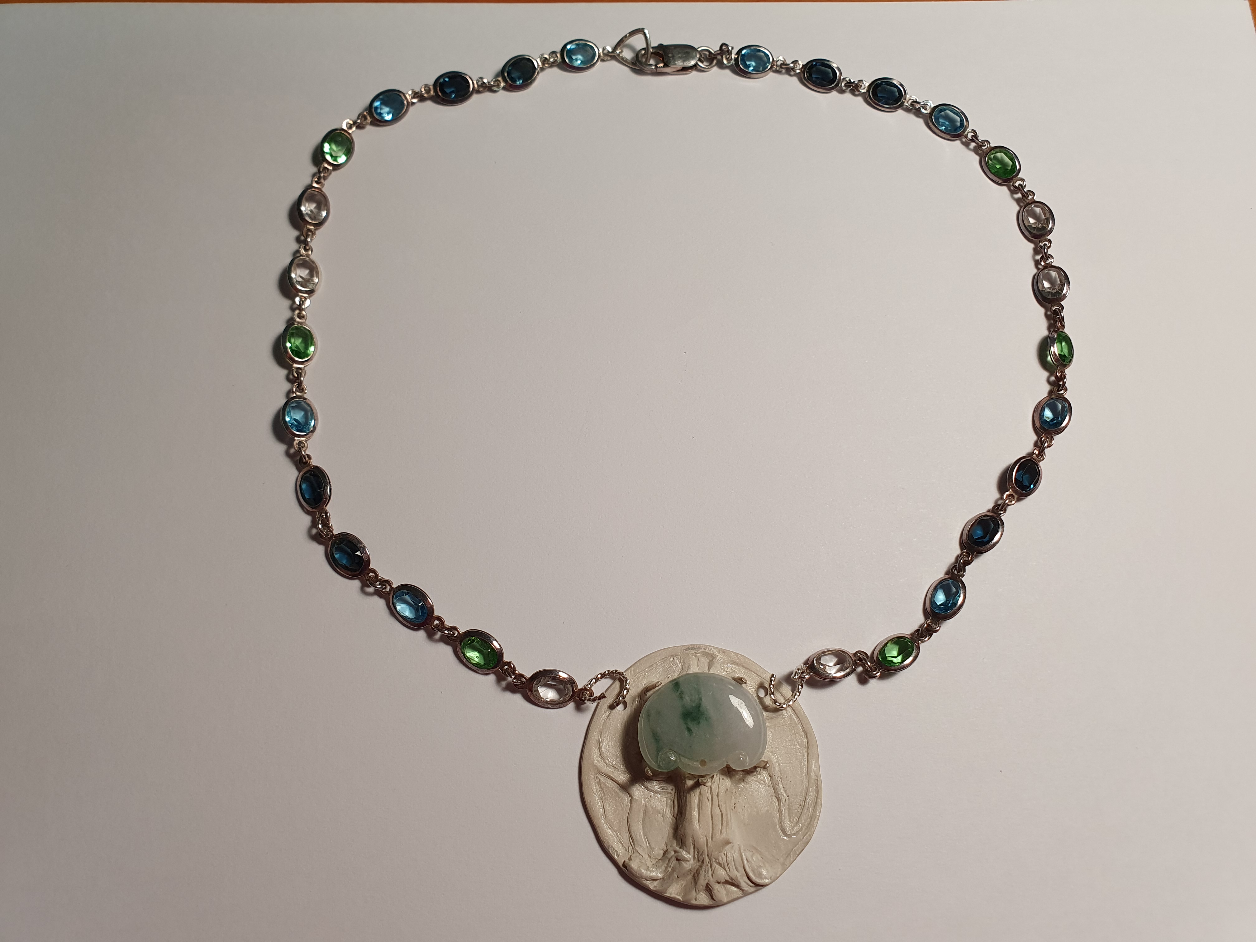 | Story of the piece | Most parts of two old necklaces and an old bracelet were upcycled and transformed into a necklace. The jade pendant from the old necklace is whitish with some shades of green. When the pendant is inverted, it can be viewed as the crown of a tree. As trees are considered the lungs of the Earth, this is related to the theme: Mother Earth. This becomes the centerpiece in the new necklace. This centerpiece (a.k.a. Lungs of the Earth) is fashioned as a tree with planet Earth in the background. The planet Earth in the background is self-explanatory as it represents itself. The clear, green and blue stones taken from both the old necklace and bracelet, now forms the chain for the new necklace. The colours of the stones represent the land and sea on Mother Earth. The upcycled parts are made of 925 silver, 999 silver and jade. |