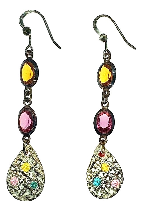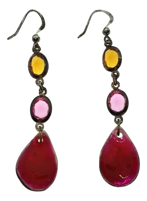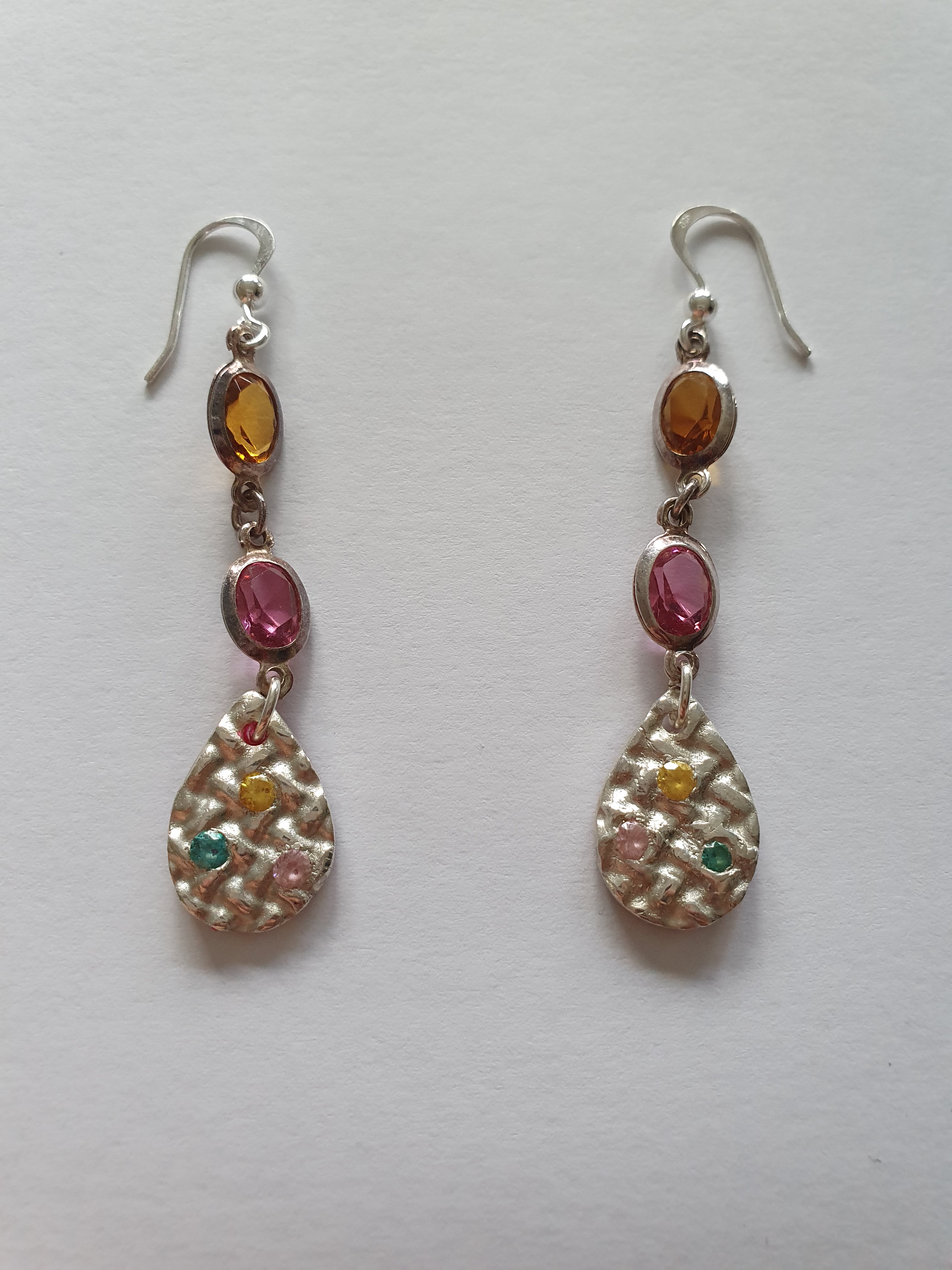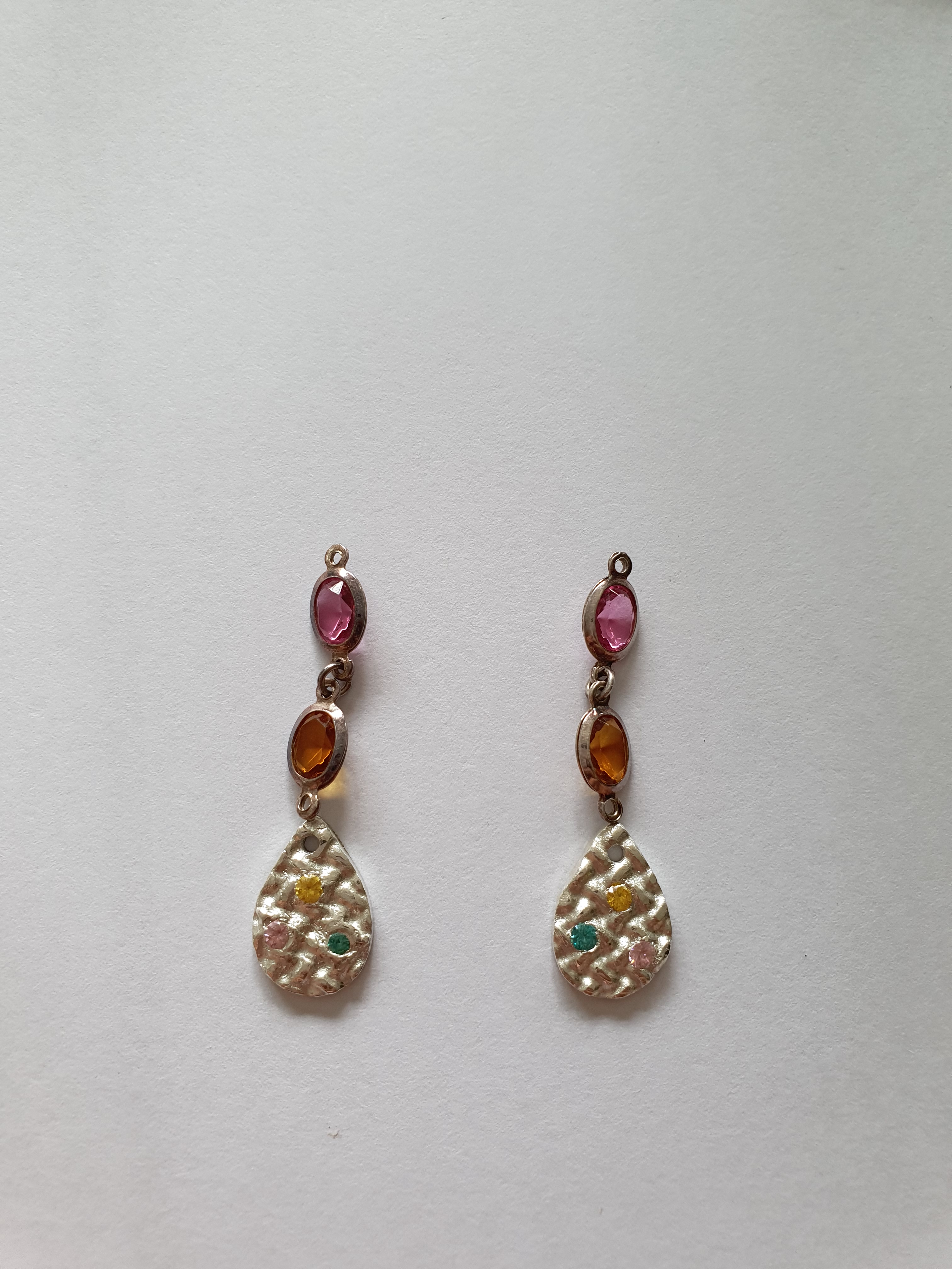 | List of materials used | Upcycled/Recycled materials used: 1. Orange and pink stones from old necklace and bracelet 2. Jump rings and clasp from old necklace and bracelet 3. Recycled silver bits and leftovers from past Art Clay Silver projects 4. Glass pendant from old necklace New additional materials used: 1. Art Clay Silver (recycled silver) 2. Coloured cubic zirconia stones 3. UV resin 4. Ear hooks |