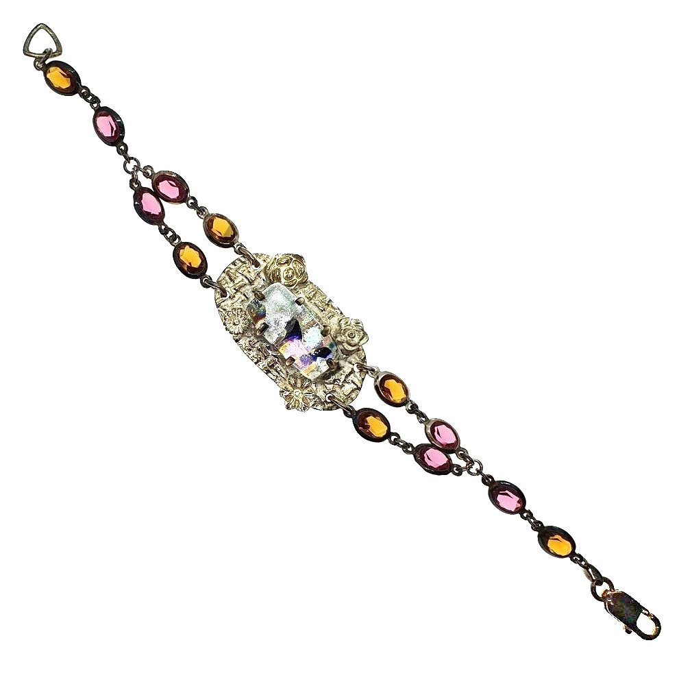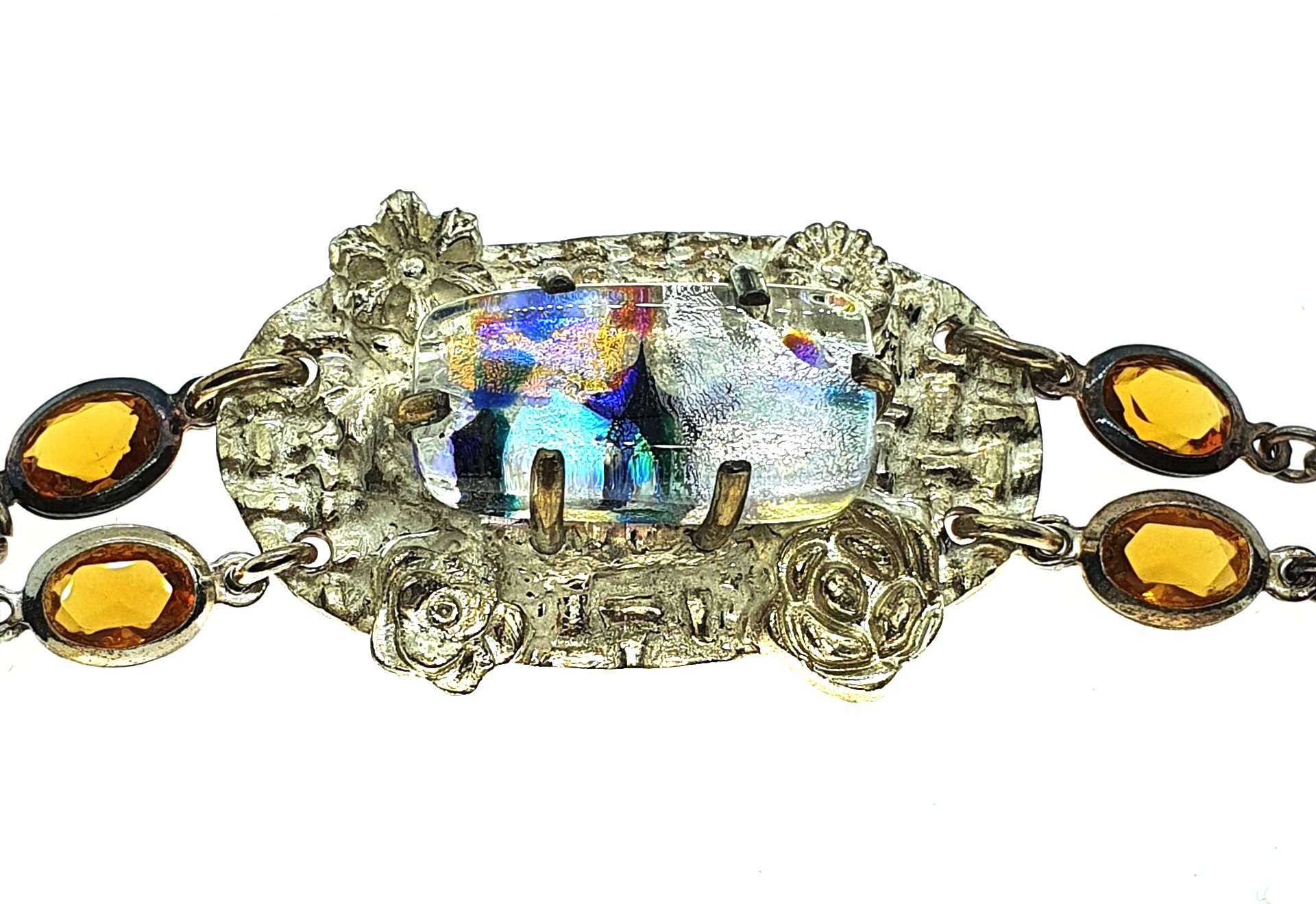 | Story of the piece | Most parts of two old necklaces and an old bracelet were upcycled and transformed into a bracelet and a matching pair of earrings. The glass pendant from the old necklace is colourful with shades of blue, yellow, green, silver, pink and black etc. when viewed from different angles. This is in close resemblance to the theme: Mother Earth, for her diversity in nature. This becomes the centerpiece in the new bracelet. This centerpiece (a.k.a. Mother Earth) is supported by four different variety of flowers found in nature, representing the four corners of the Earth. The four corners of the Earth, the old way of saying “Every part of the Earth”, represented by the flowers, lay on a base with a weave design. The weave design on both the new bracelet and earrings shows that the relationship between both living and non-living organisms is interlinked together in a complex way. The orange and pink stones upcycled from both the old necklace and bracelet, now form the chain for the new bracelet as well as the connections for the matching pair of earrings. They represent the rays of the Sun shining on Mother Earth. The upcycled parts are made of 925 silver, 999 silver and glass. |